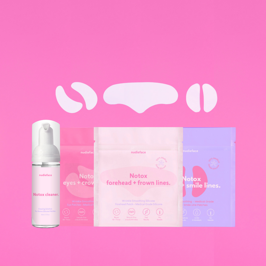 Notox Forehead + Eyes + Smile Lines Patches includes our best selling Notox Silicone Patches Forehead, Eyes, Mouth and our specially formulated silicone patch cleaner.